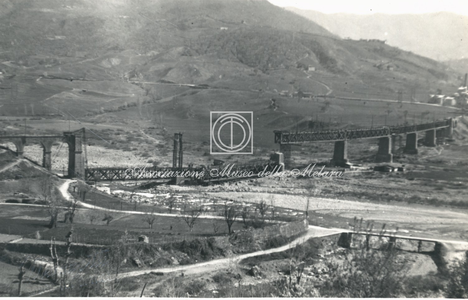 La VI e la VII travata calate in posizione orizzontale. La VII è già allineata sopra la pila VI (nascente). La V travata appoggiata su puntelli metallici per la riparazione della V pila.